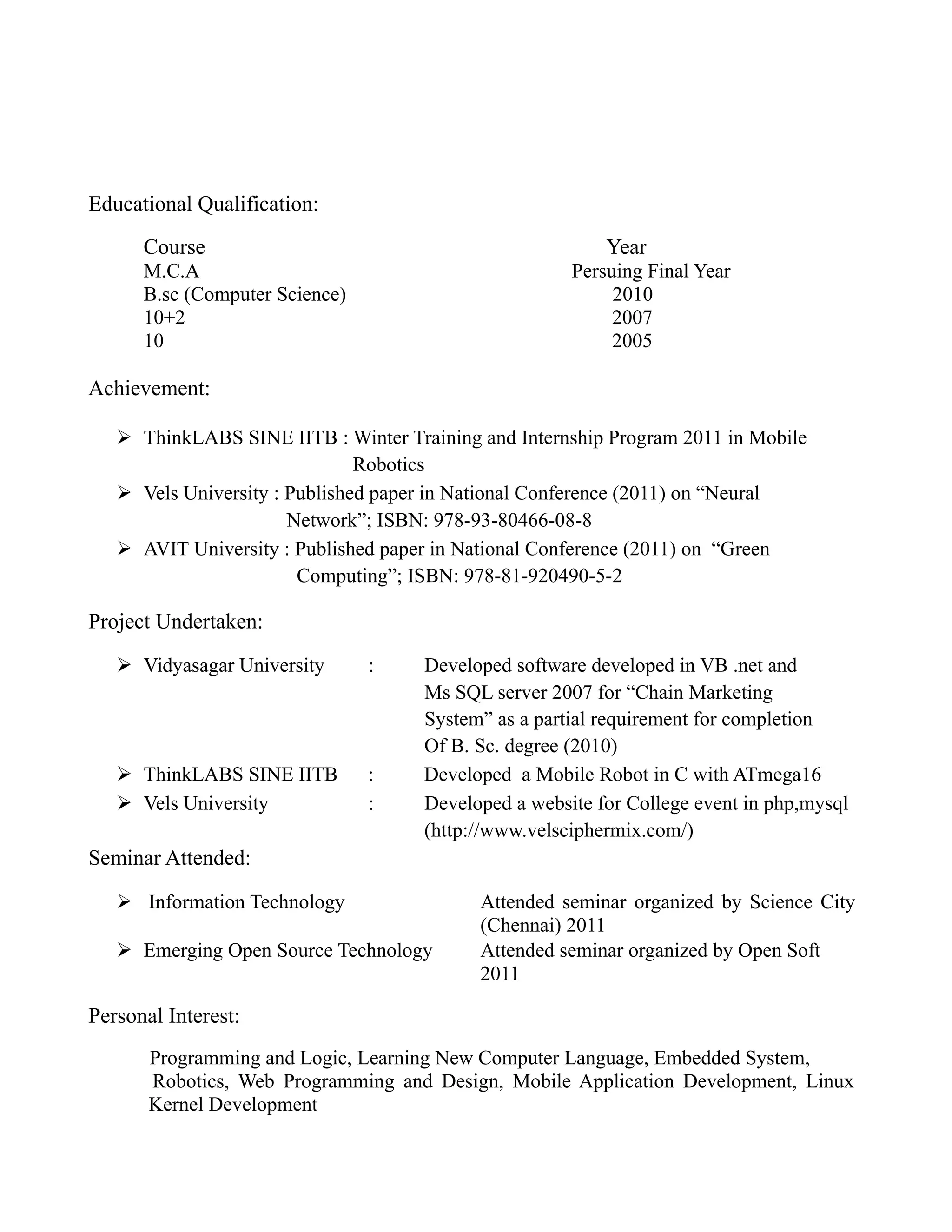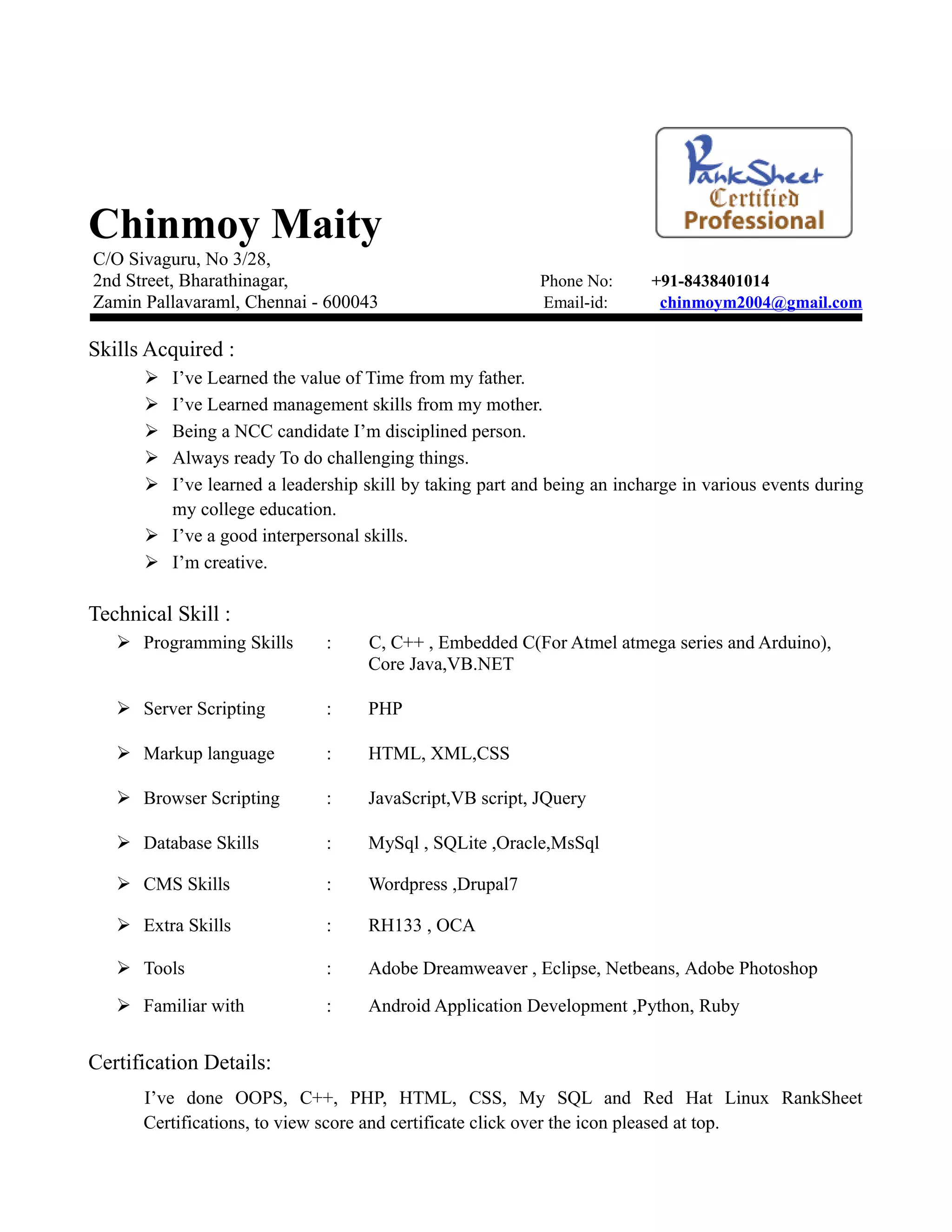 This document contains contact information and a resume for Chinmoy Maity. It outlines his skills including time management, leadership, interpersonal skills and creativity. It details his technical skills in programming languages like C, C++, Java, and databases like MySQL. It lists his certifications in programming and Red Hat Linux. It provides his educational qualifications including an ongoing MCA degree. It highlights achievements, projects completed, seminars attended, and personal interests in areas like programming, robotics, and mobile development.