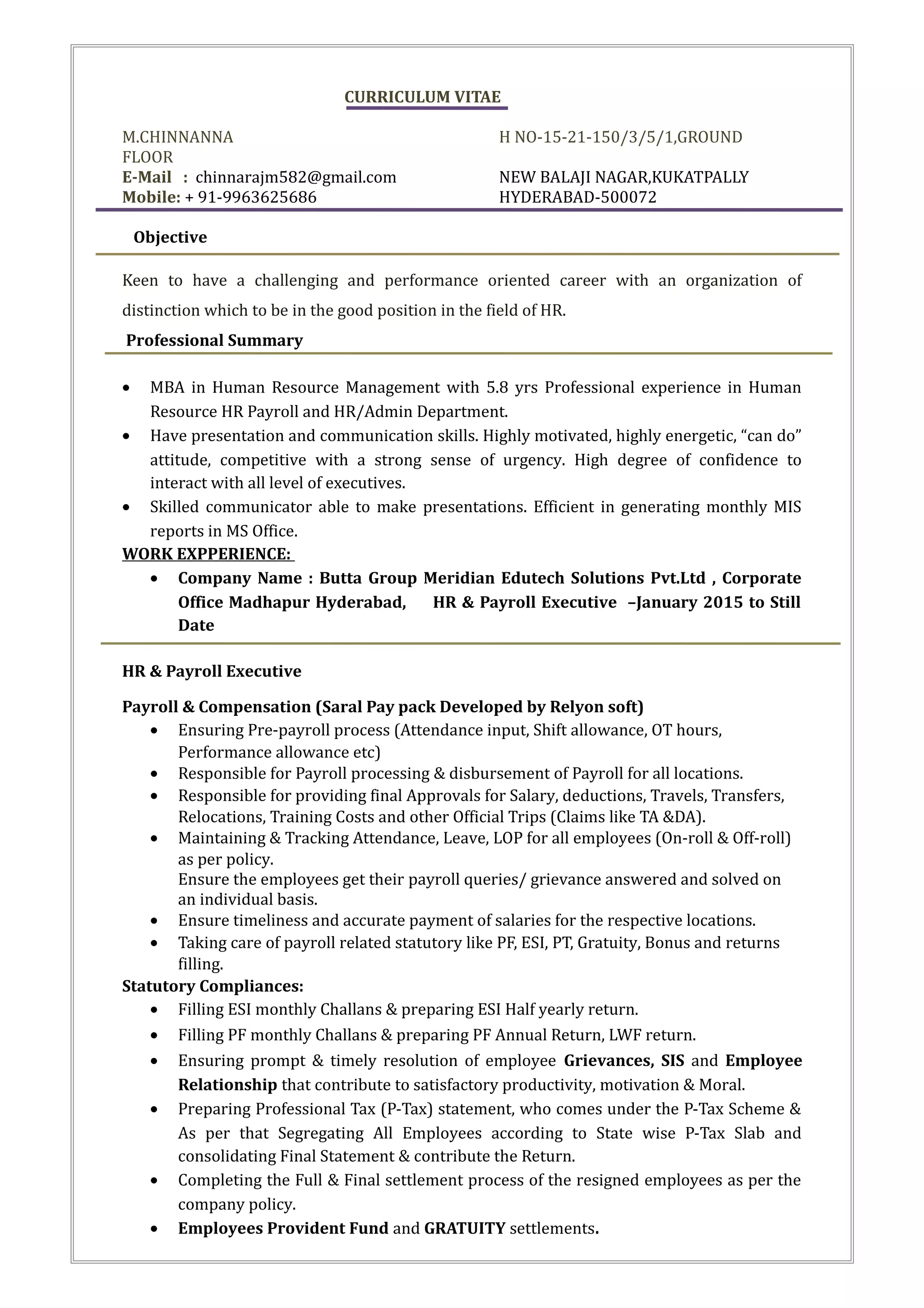 M. Chinnanna has over 5 years of experience in human resources and payroll. He is seeking a challenging career in HR. He has skills in payroll processing, statutory compliance, recruitment, and employee relations. Currently he works as an HR and Payroll Executive handling all aspects of HR from recruitment to exit formalities.