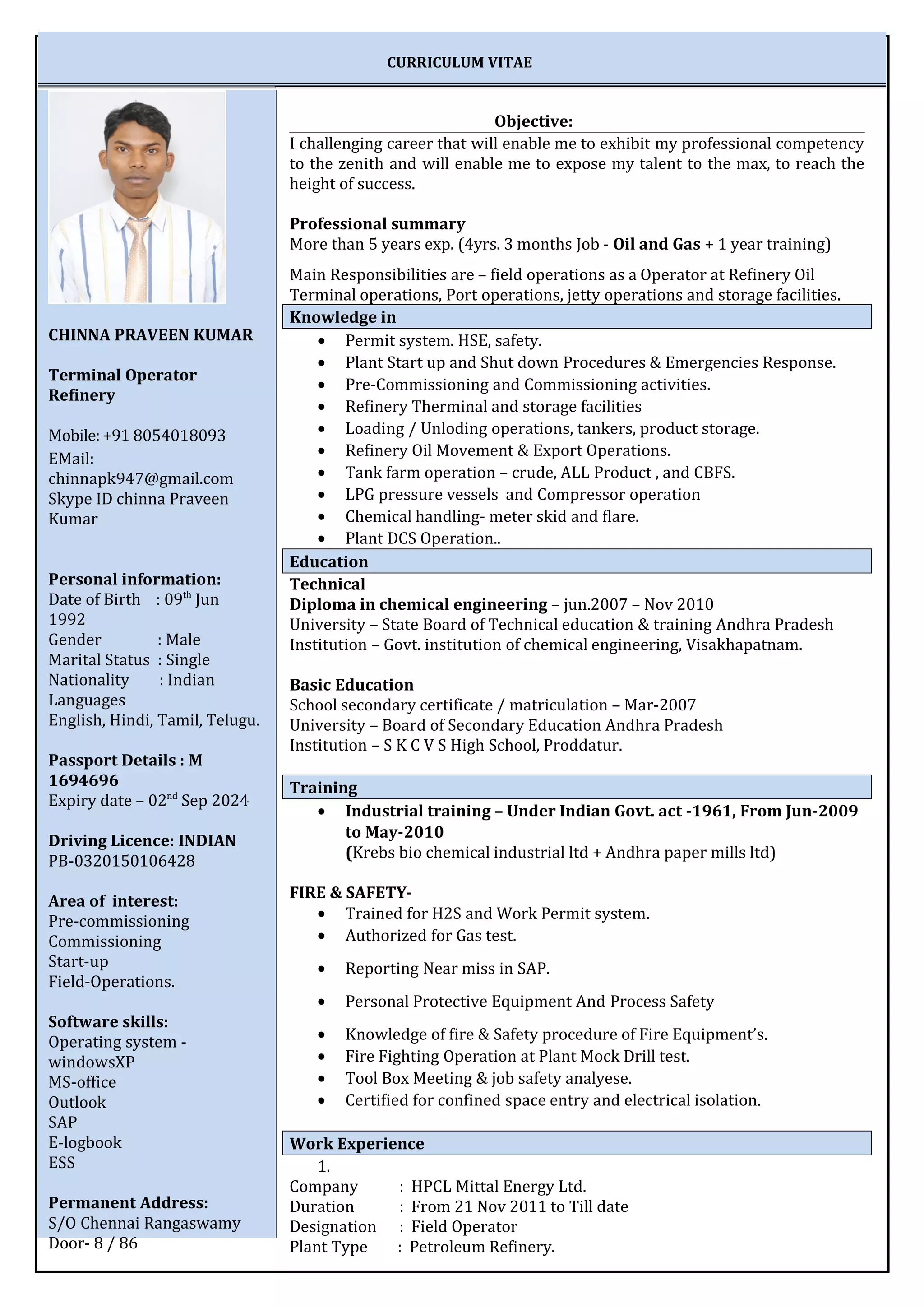 Chinna Praveen Kumar is a Terminal Operator with over 5 years of experience in oil and gas operations. He currently works for HPCL Mittal Energy Ltd. in Bathinda, India, where his responsibilities include operating equipment like pumps, meters, tanks, and pipelines to receive, store, blend, and dispatch crude oil and refined products. He also assists with the commissioning of new facilities and equipment. Previously, he worked for Hi Tech Carbon managing carbon black feedstock storage and handling operations.