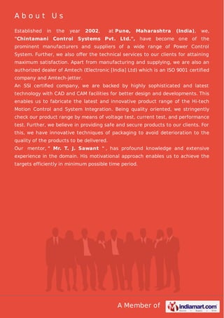 Chintamani Control Systems Pvt. Ltd. is a manufacturer and supplier of power control systems and AC control devices established in 2002 in Pune, India. It offers a wide range of products including AC drives, variable frequency drives, control panels, and motion control systems. The company has 11-25 employees and certifications in quality standards. It prides itself on its large product line and capabilities in contract manufacturing and OEM services.