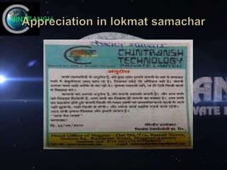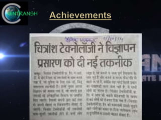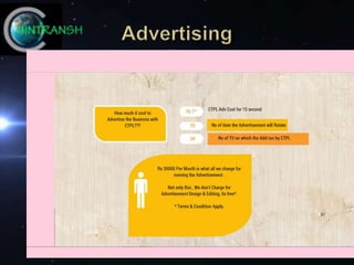 The document discusses various types of advertising methods including LED advertising. It notes that Chintransh Technology Pvt Ltd has over 25 franchises and 9 branches across India with 7,000 LED displays installed. LED displays in Mumbai number over 1,000 with a combined viewership of millions. The advantages of LED advertising are also summarized, including the ability to reach large audiences and build consumer trust through visual and motion elements. Some disadvantages of other advertising methods like television, radio, online and mobile are also briefly outlined.