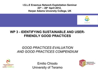 The document summarizes the results of Work Package 2 which identified good practices related to education for sustainable development from questionnaire responses and national reports. It presents 42 good practices analyzed from 17 countries and groups them into four areas: teaching, institutional activities, policies, and practical activities. For each area, it provides examples of emerging good practices and evaluates the practices based on their relevance and potential for spreading. The most highly evaluated practices focused on integrating sustainability across disciplines, developing study programs incorporating sustainable development, and hands-on student activities.