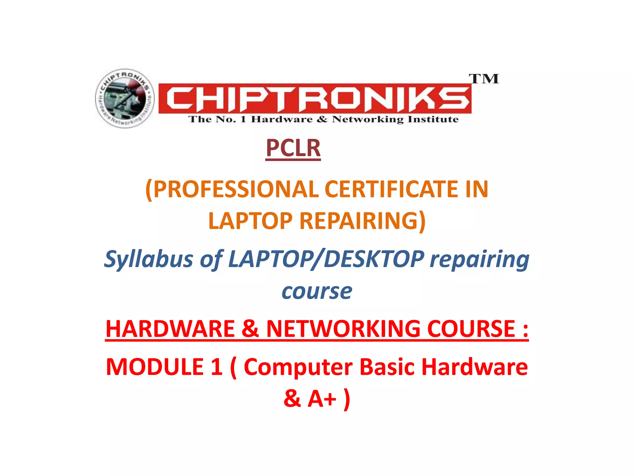 The document outlines the syllabus for a Professional Certificate in Laptop Repairing (PCLR) course, covering fundamental and advanced topics in computer hardware, laptop repair, and networking. It includes practical modules on components assembly, troubleshooting, and chip-level repairing for both desktops and laptops. The course aims to provide comprehensive skills and knowledge required for careers in computer and laptop repair.