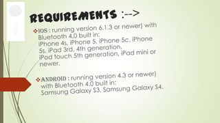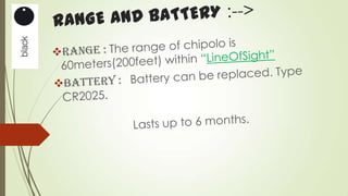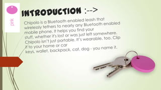 Chipolo is a small Bluetooth tracker that can be attached to items to help locate them using a smartphone app. It has a range of 60m and notifies the user if an item goes in or out of range. Chipolo can also be used to locate a misplaced smartphone by shaking the Chipolo. It is portable, comes in various colors, and has advantages like helping find lost items, but disadvantages include its limited range and potential battery life.