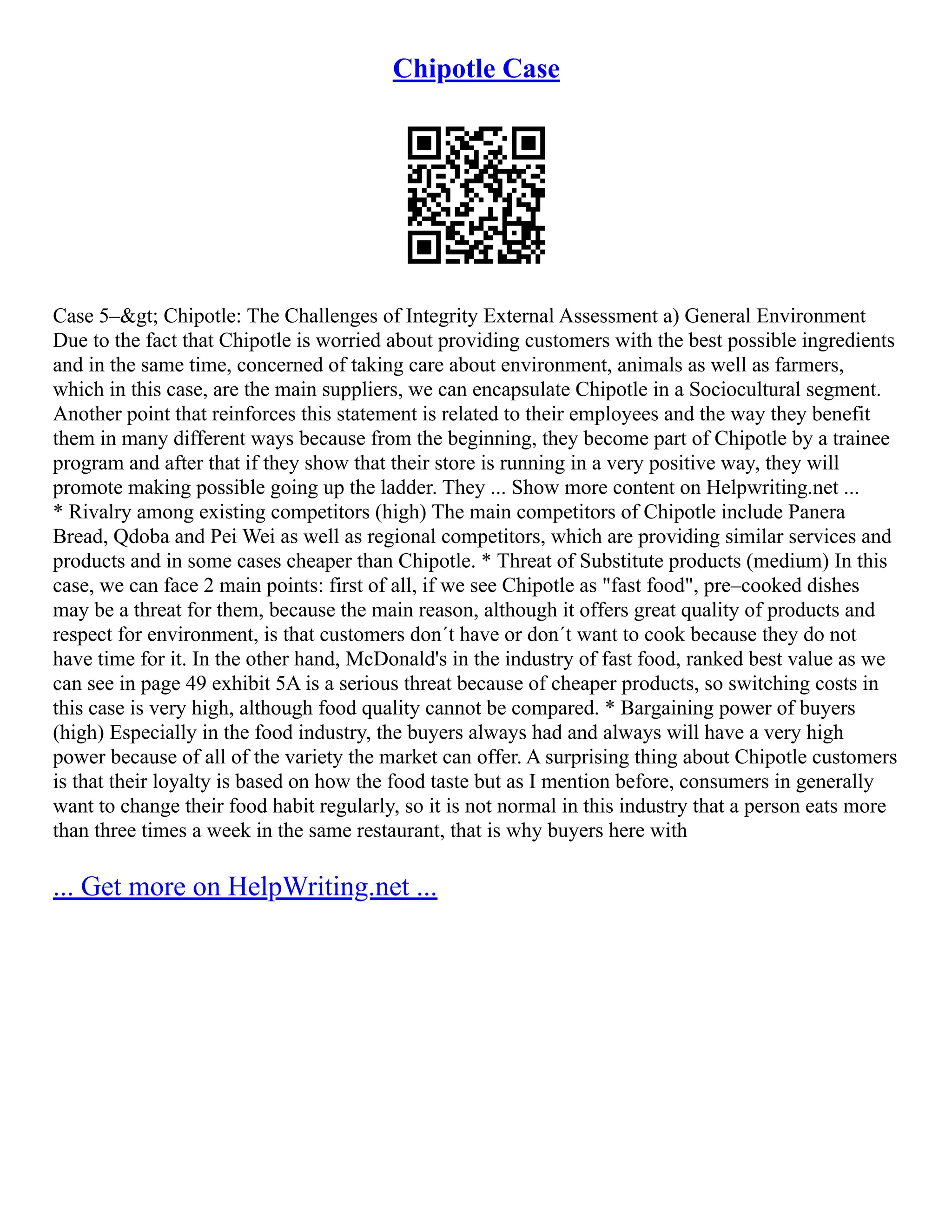 Chipotle was founded in 1993 and focuses on using high quality, fresh ingredients for its Mexican-inspired menu items like burritos, tacos, and bowls. The document discusses Chipotle's growth over the years from 8 locations in 1996 to over 2,250 restaurants in the U.S. alone by 2016, making it one of the most popular fast casual restaurant chains. McDonald's was an early investor in Chipotle but withdrew in 2006 when Chipotle went public, and the chain has continued expanding its "Food with Integrity" philosophy across the U.S. and internationally.