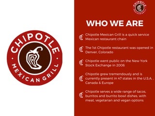 The document outlines Chipotle's digital marketing strategy aimed at rebuilding its brand reputation following food safety incidents, focusing on increasing online ordering and transparency about food sourcing. It details the target audience, marketing tactics such as influencer partnerships and social media engagement, as well as metrics for measuring success. The goal is to boost revenue and regain consumer trust while promoting the brand's commitment to healthy, organic meals.