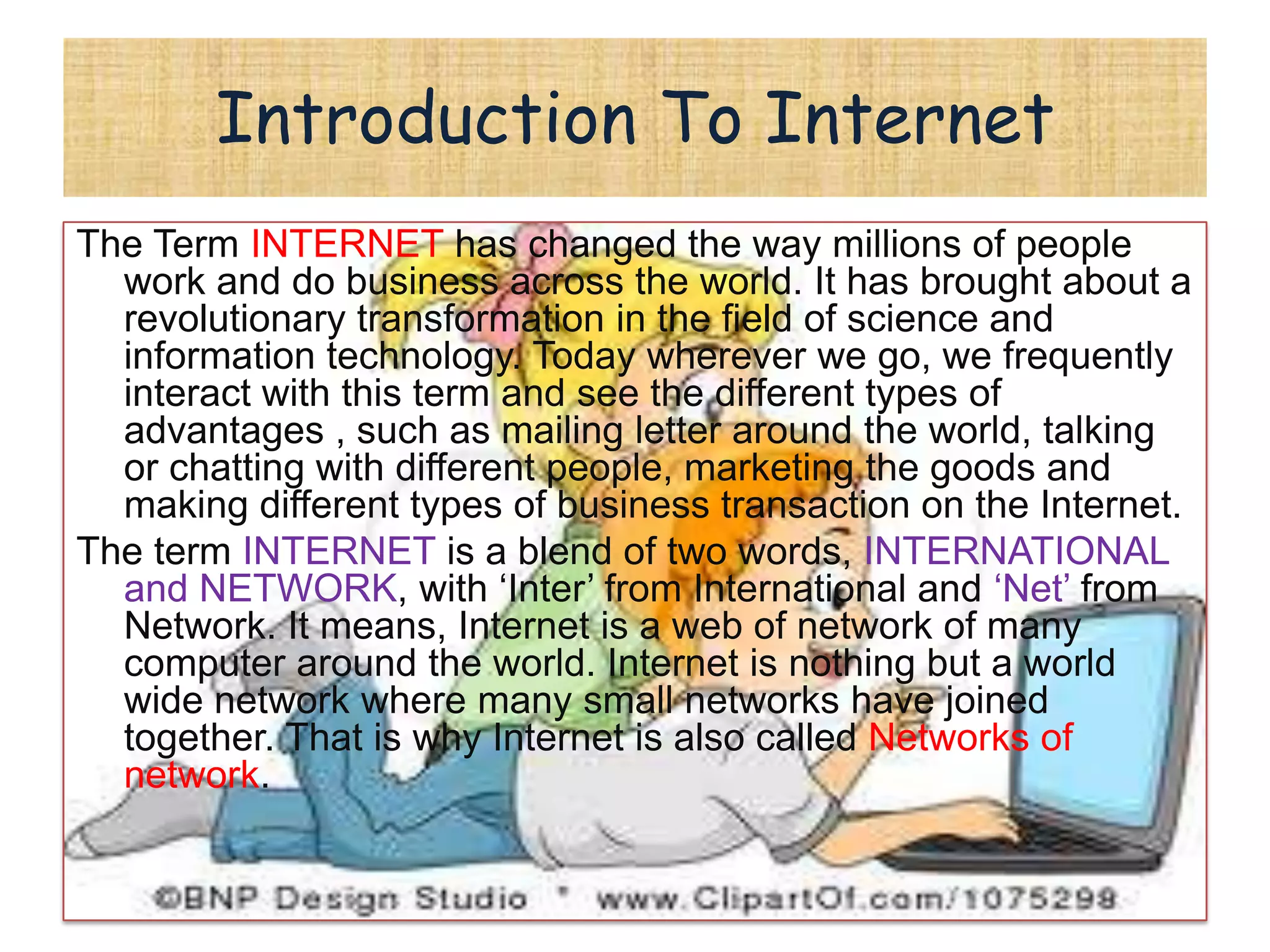 The document provides an introduction to the Internet, including:
