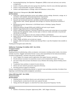 Chiranjit Dutta has over 8 years of experience in application support, IT infrastructure, and customer service. He currently works as a senior systems engineer at Syntel providing application performance monitoring for Allstate Insurance. Previously he has worked at Halliburton Technology and Infosys BPO in various IT support roles. He has skills in application support, problem solving, VMware, UNIX, load testing tools, and application performance monitoring tools.