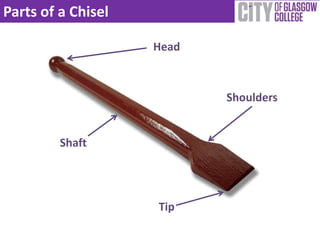 This document provides information about masonry chisels. It describes the parts of a chisel including the head, shoulders, and shaft. Chisels are typically made of high carbon tool steel with a tungsten carbide tip. Different types of chisel heads and uses are outlined, including standard, bullnose, fishtail, and lettering chisels. Granite and marble chisels are designed to be more durable due to the hardness of those materials. Chisels can be sharpened manually or mechanically using grinding wheels or diamond sharpening blocks.
