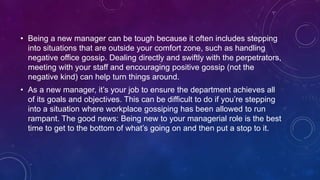 The document provides 5 tips for new managers to stop negative office gossip: