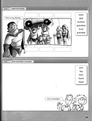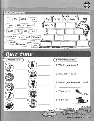 This document appears to be pages from a workbook for early readers. It includes exercises like circling and writing colors, matching pictures to words, drawing and labeling a pencil case, and finding a secret word. The exercises get progressively more difficult and seem aimed at practicing basic literacy skills like letter-sound recognition, vocabulary, and following multi-step instructions.