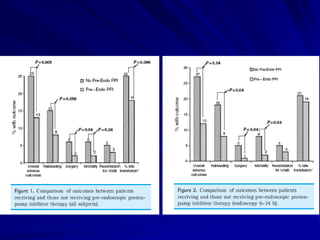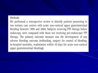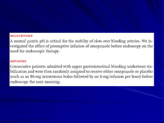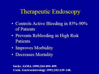 Initial resuscitation of patients with upper GI bleeding is critical and includes IV access, oxygen, fluid resuscitation, and blood product transfusion if needed. Early risk stratification evaluates factors like age, comorbidities, hemodynamic stability, and endoscopic findings to determine risk of rebleeding, need for intervention, and mortality. Source of bleeding is identified through endoscopy within 24 hours when possible. For low risk patients, medical therapy with PPIs is usually sufficient, while high risk patients may require endoscopic treatment or radiologic intervention. High dose PPIs, especially IV formulations, are effective in preventing rebleeding and shortening hospital stays when given before and after endoscopy. Surgery is reserved for