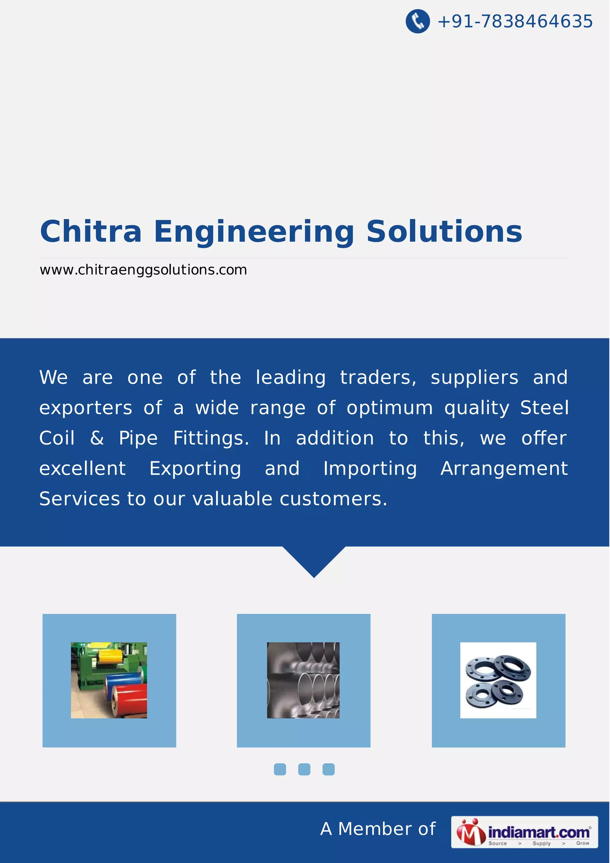 Chitra Engineering Solutions is a supplier, trader, and exporter of steel products established in 2013 in Vadodara, India. It offers products like steel coil, seamless pipe fittings, and forged flanges made from stainless steel. The company works with certified vendors to ensure high quality and trades in products that are durable and precisely engineered. It aims to meet bulk orders efficiently and provide importing/exporting services and payment options for customers.
