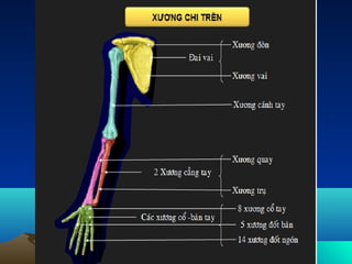 Tài liệu cung cấp thông tin về giải phẫu chi trên và chi dưới, bao gồm cấu trúc xương, cơ, mạch máu và thần kinh. Nó mô tả các nhóm cơ khác nhau, đặc điểm chức năng của các khớp và cấu trúc của vị trí và hình dạng các xương. Những thông tin này rất quan trọng cho việc hiểu biết về hệ vận động của cơ thể.