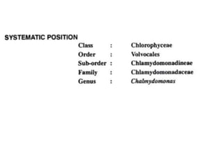 Chlamydomonas is a single-celled green alga that is found in fresh water environments like ponds, ditches, and wet soil. It reproduces both asexually through the production of zoospores and sexually through isogamy, anisogamy, or oogamy depending on the species. The cell contains a cup-shaped chloroplast, pyrenoid, two flagella, contractile vacuoles, and sometimes an eye spot. Chlamydomonas is used as a model organism in research due to its simple structure and life cycle.
