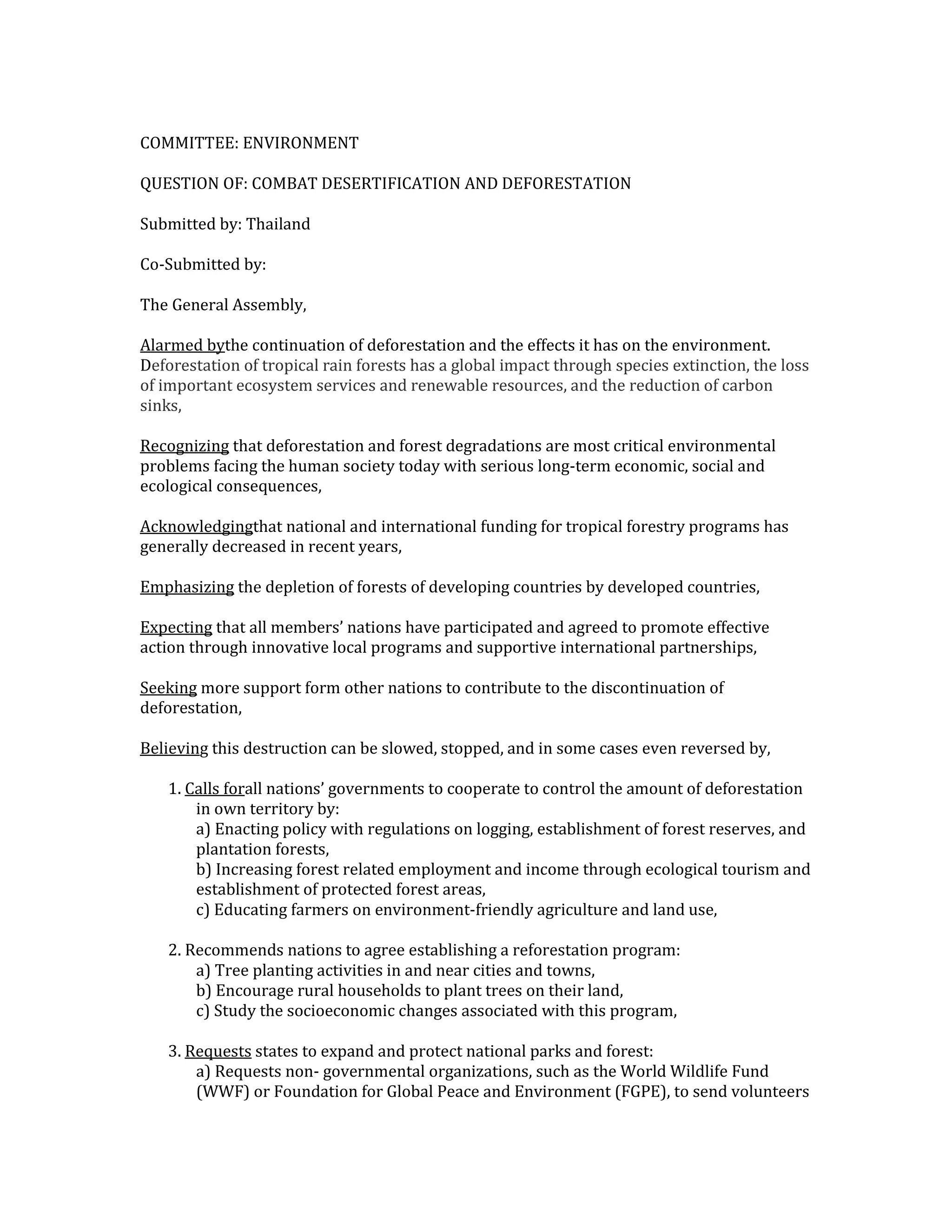 The committee discusses combating deforestation and desertification. It recognizes that deforestation is one of the most critical environmental problems and has serious long-term economic, social, and ecological consequences. While acknowledging that funding for forestry programs has decreased, it emphasizes that developed countries have depleted forests in developing countries. The committee calls on all nations to cooperate to control deforestation through enacting logging policies, increasing forest-related employment, and educating farmers on sustainable practices. It also recommends establishing reforestation programs, expanding and protecting national parks and forests by increasing volunteer monitoring and punishments for deforestation in protected areas. Finally, it calls for a subcommittee to control funds for education on deforestation issues and