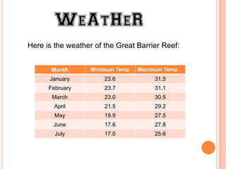 The Great Barrier Reef weather document provides a table showing average minimum and maximum temperatures from January to July. It then lists several facts about ocean life like green turtles migrating over 1400 miles to lay eggs, ocean life beginning 3-3.4 billion years ago, and most sharks being over 1.8 meters long. Finally, it lists several oceans and reefs around the world.