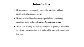 The document outlines the importance of safe drinking water and the processes involved in water disinfection, particularly through chlorination. It details the sources, purification methods, and specific phases of chlorination, including using chemicals like chlorine and its compounds to eliminate harmful microorganisms. Additionally, the document covers practical applications, testing methods for chlorine demand, and guidelines for effective water treatment.