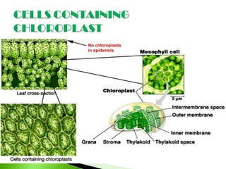 This document provides information about PowerPoint and chloroplasts. It introduces PowerPoint as a commonly used presentation program that can enhance teaching when used carefully. Next, it defines chloroplasts as structures in plant cells that contain chlorophyll and are involved in photosynthesis. Chloroplasts have an inner and outer membrane, with an internal area called the stroma containing enzymes, and membrane sacs called thylakoids that contain chlorophyll and are arranged in stacks called grana. Chlorophyll absorbs mainly blue and red light, reflecting green light and giving plant parts their green color.
