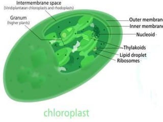 Chloroplasts are green double membrane-bound organelles primarily located in the mesophyll cells of leaves, responsible for photosynthesis. They contain chlorophyll, which absorbs sunlight and drives the synthesis of carbohydrates, and various accessory pigments that assist in light absorption. The structure includes thylakoids, grana, and a stroma that houses enzymes and DNA necessary for metabolic processes.