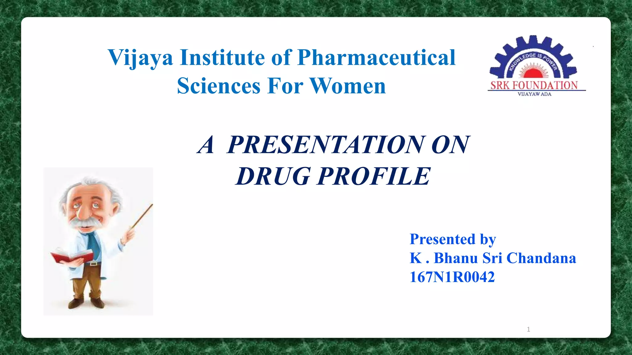 This document presents information on the drug chloroquine, an anti-malarial agent. It discusses chloroquine's introduction, chemical and physical properties, pharmacokinetics, mechanisms of action, indications, contraindications, interactions, and administration. Key points include that chloroquine is a quinoline derivative effective against malaria parasites, it has excellent oral absorption and distributes widely in tissues, and its primary mechanisms involve preventing heme detoxification and accumulating toxic levels of heme in parasites.