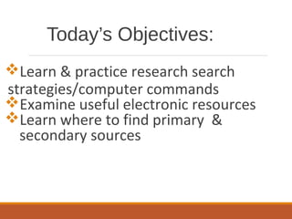 This document outlines strategies for research, including developing search terms and questions, using databases to find primary and secondary sources, and evaluating resources. It discusses developing a search strategy using keywords, Boolean operators, truncation and adjacency. It provides examples of searching specific databases to find primary sources like interviews and secondary sources like articles. Tips are provided for narrowing or broadening searches based on results. The librarian offers additional research help resources.