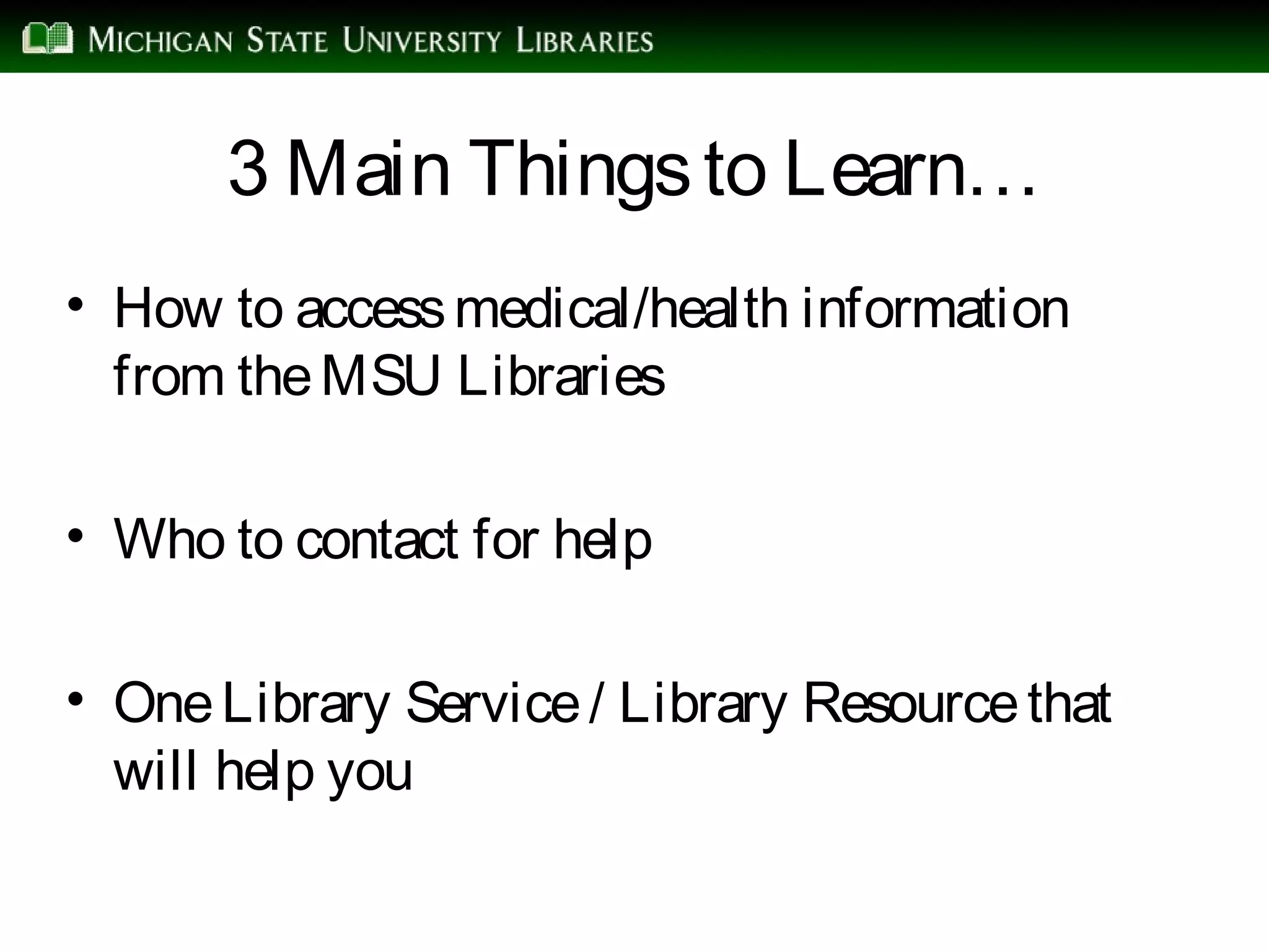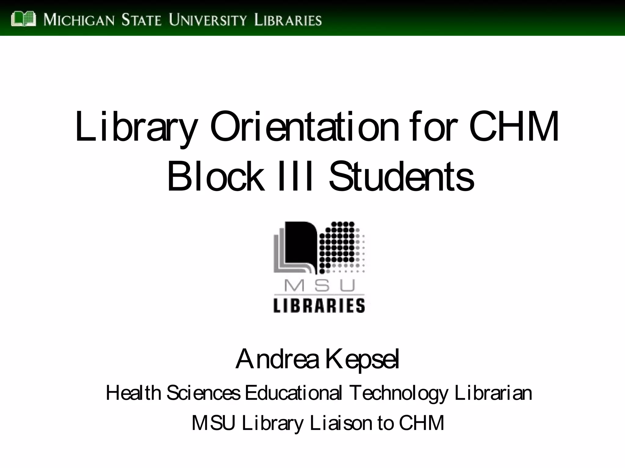 This document provides an orientation for CHM Block III students on using library resources. It introduces Andrea Kepsel as the CHM liaison librarian and provides her contact information. It outlines three main things for students to learn: how to access health information from MSU Libraries, who to contact for help, and one library service/resource that will help. It then describes several key library resources for medical students, including the Health Sciences Digital Library, medicine databases, ebooks, point-of-care tools, and resource guides. It also provides information on off-campus access, finding full-text articles, using ebooks, and getting help if materials cannot be found.