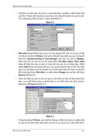 Tài liệu mô tả các phương pháp biến đổi và thao tác trên tập dữ liệu trong SPSS, bao gồm việc mã hóa lại các giá trị trong một biến (recode) thành các giá trị mới phù hợp với yêu cầu phân tích. Các phương pháp này bao gồm recode vào cùng một biến hoặc vào một biến khác, cùng với cách sử dụng các công cụ tự động mã hóa và chọn lựa các quan sát nhất định. Tài liệu cũng nhấn mạnh tầm quan trọng của việc cấu hình lại các giá trị và điều kiện để đảm bảo tính chính xác trong phân tích dữ liệu.