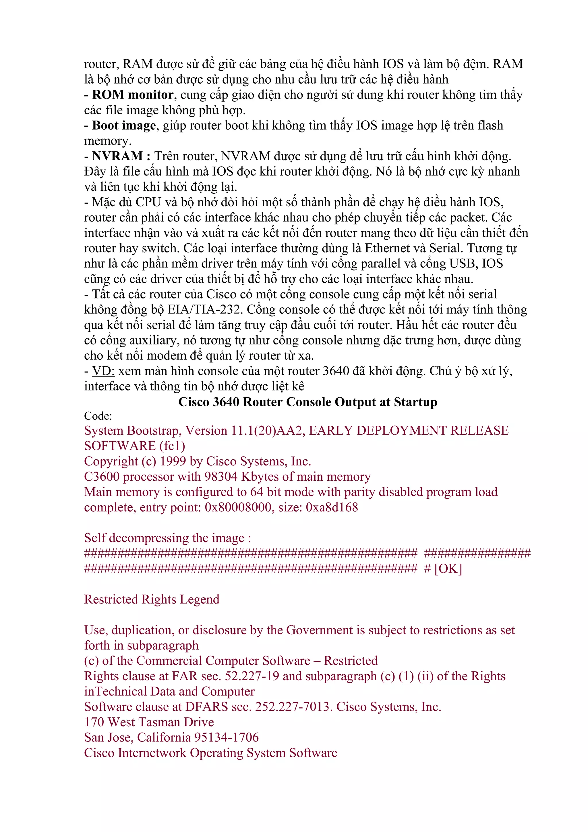 Chương 2 của tài liệu cung cấp cái nhìn tổng quan về hệ điều hành Cisco IOS, bao gồm kiến trúc hệ thống, các loại bộ nhớ trên router và chế độ lệnh khác nhau cho người dùng. Nó cũng nhấn mạnh tầm quan trọng của việc bảo mật trên router thông qua việc cài đặt mật khẩu và các cấp độ mã hóa khác nhau. Cuối cùng, tài liệu hướng dẫn từng bước cài đặt mật khẩu cho router và cách xem lại cấu hình đã thiết lập.
