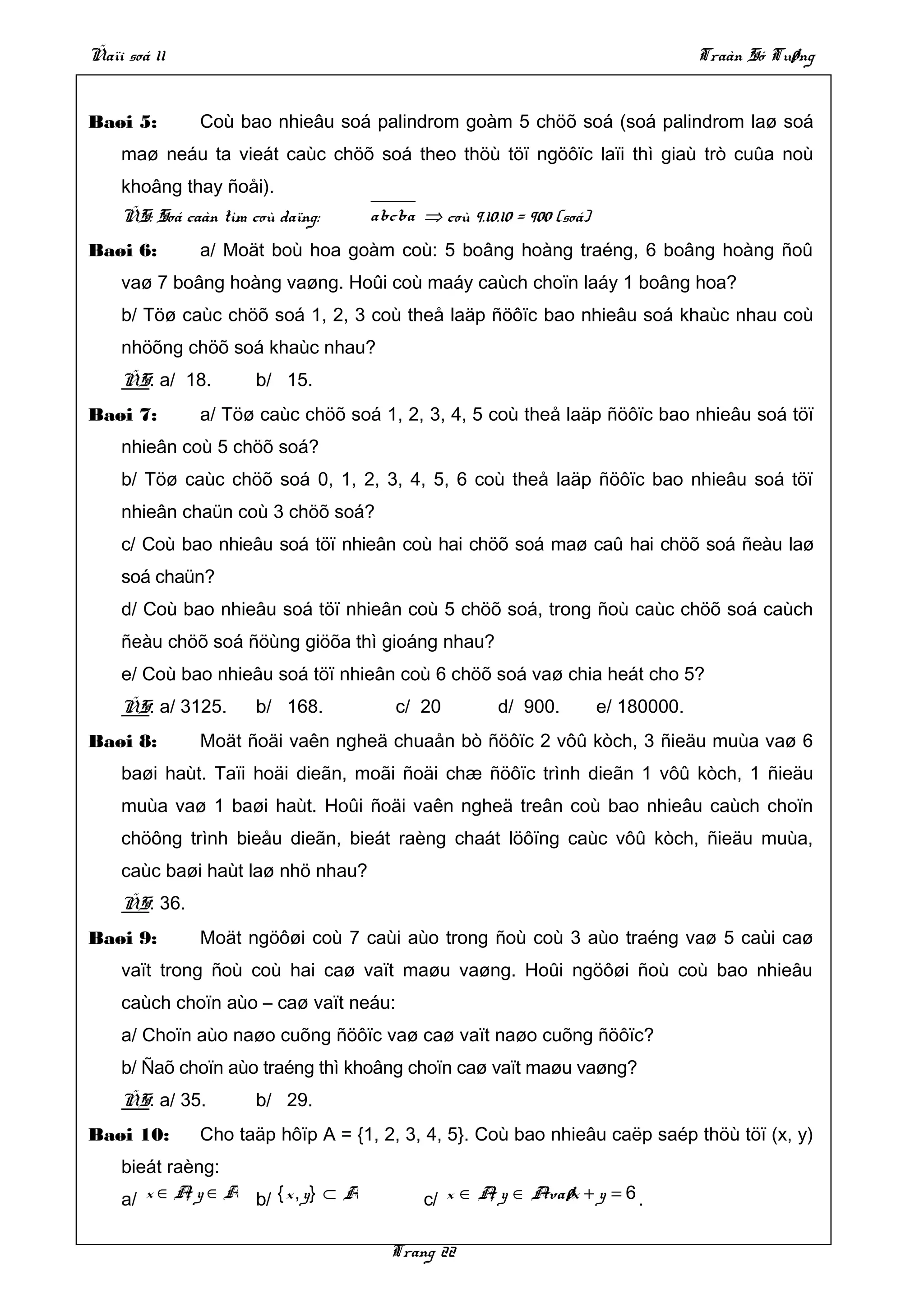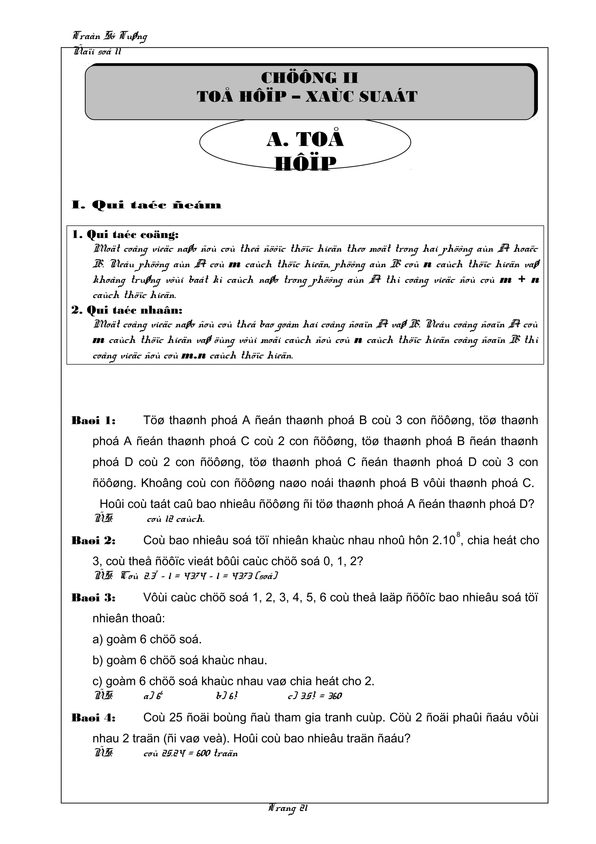 Tài liệu trình bày các khái niệm và quy tắc liên quan đến xác suất và tổ hợp, bao gồm các ví dụ minh họa. Nó giải thích cách tính số cách thực hiện các công việc khác nhau thông qua các quy tắc tổ hợp. Nội dung bao gồm nhiều bài toán cụ thể để ứng dụng các lý thuyết đã nêu.