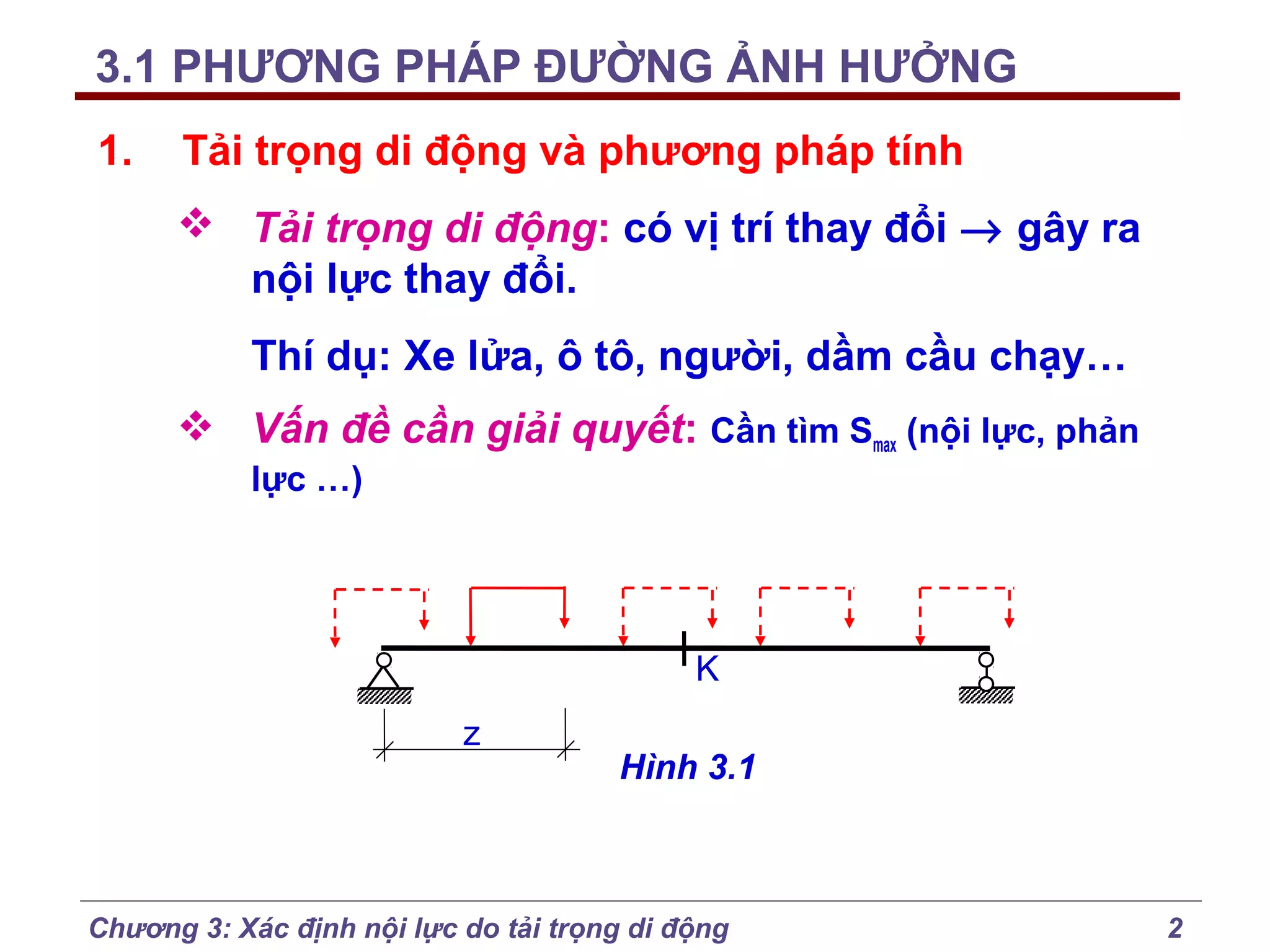 Chương 3 của bài giảng cơ học kết cấu trình bày phương pháp đường ảnh hưởng để xác định nội lực do tải trọng di động, bao gồm cách vẽ đồ thị và phân tích các lực tác động. Phương pháp này giúp tính toán nội lực dễ dàng hơn trong các tình huống phức tạp với nhiều vị trí tải trọng. Ngoài ra, chương cũng đề cập đến các trường hợp đặc biệt như dầm tĩnh định đơn giản và hệ có mắt truyền lực.