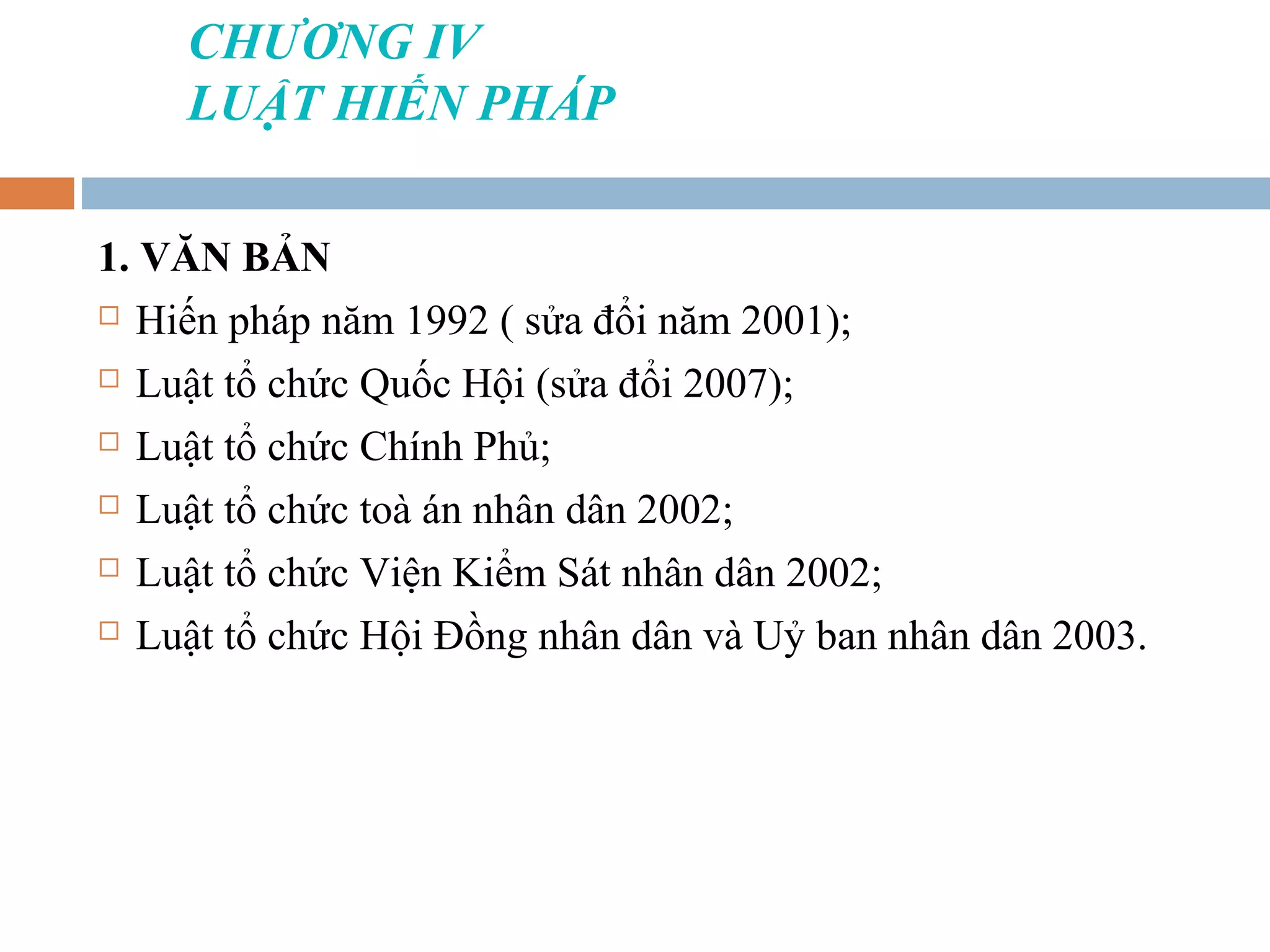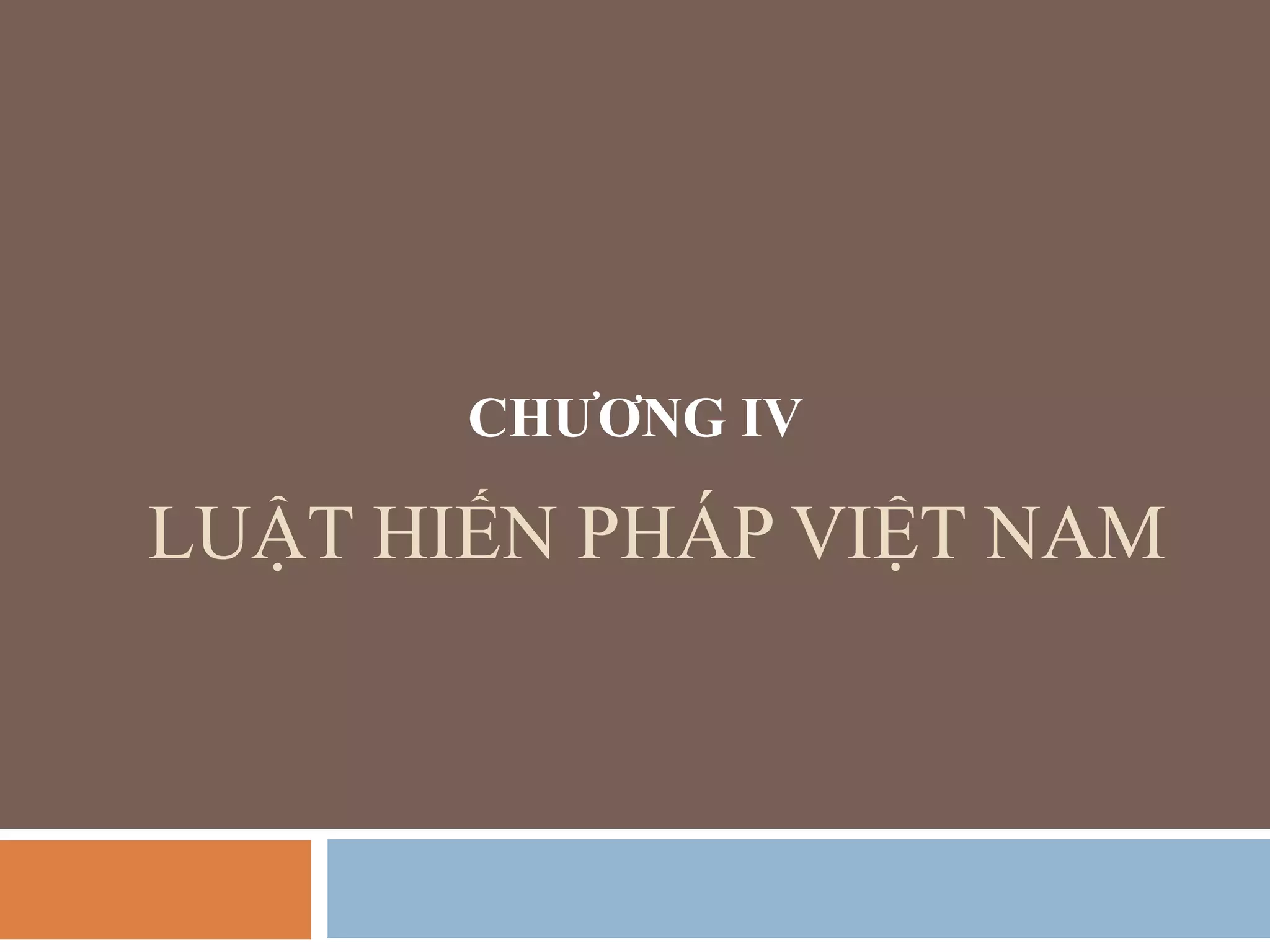 Chương IV của tài liệu bàn về luật hiến pháp Việt Nam, bao gồm các văn bản pháp lý và các chế định cơ bản như chế độ chính trị, chế độ kinh tế, địa vị pháp lý của công dân, và chính sách văn hóa - xã hội. Luật hiến pháp xác định những quy tắc pháp lý quan trọng ảnh hưởng đến tổ chức và hoạt động của bộ máy nhà nước, quyền và nghĩa vụ của công dân. Tài liệu cũng liệt kê các nguồn luật pháp và phương pháp điều chỉnh trong lĩnh vực này.