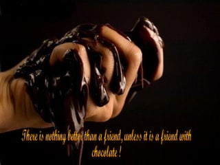 This document discusses the joys of chocolate and suggests that chocolate makes everything better. It claims that eating dark and white chocolate in equal amounts provides a balanced diet and that chocolate covered fruits count as fruit. It also lists the four basic food groups as different types of chocolate and declares that while one cannot live on chocolate alone, it is enjoyable to try.