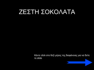 Chocolate 1. 2. Μερικοί απόφοιτοι, με καλές δουλειές πλέον, συζητούσαν για τις ζωές τους σε μία «γιορτή σχολικής επανένωσης». Αποφάσισαν να επισκεφτούν τον παλαιό καθηγητή τους, συνταξιούχο πλέον, που πάντοτε ήταν πηγή έμπνευσης για αυτούς. 3. Κατά την επίσκεψη, η συζήτηση περιστράφηκε γύρω από τα παράπονα τους για την δουλειά, την ζωή τους και τις σχέσεις τους με τους άλλους. 4. Ο καθηγητής τους έφτιαξε ζεστή σοκολάτα σε μια μεγάλη καράφα, φέρνοντας ταυτόχρονα και πολλές κούπες διαφόρων ειδών και υλικών, ακριβές και φτηνές, όμορφες και άσχημες. Έπειτα τους κάλεσε να σερβιριστούν μόνοι τους. 5. 6. 7. Ενώ είναι φυσικό για εσάς να θέλετε το καλύτερο για τον εαυτό σας, αυτό ακριβώς είναι η αιτία των προβλημάτων σας. 8. Η κούπα δεν προσθέτει τίποτε στην ποιότητα της σοκολάτας. Συνήθως είναι απλά πιο ακριβή και σε κάποιες περιπτώσεις κρύβει αυτό που πίνετε. 9. Αυτό που πραγματικά θέλατε ήταν ζεστή σοκολάτα. Δεν θέλατε την κούπα. Αλλά συνειδητά διαλέξατε την πιο καλή κούπα. 10. 11. 12. Η ζωή είναι η ζεστή σοκολάτα. Η δουλειά, το χρήμα και οι θέσεις εργασίας σας είναι η κούπα. 13. 14. Η κούπα που έχετε δεν χαρακτηρίζει, ούτε αλλάζει την ποιότητα της ζωής σας. 15. Μερικές φορές με το να επικεντρώνεστε στην κούπα, δεν απολαμβάνετε την ζεστή σοκολάτα που σας έχει δώσει ο Θεός. 16. 17. 18. 19. Ζήστε απλά . . . Αγαπάτε γενναιόδωρα . . . Ενδιαφερθείτε βαθιά . . . Μιλάτε ευγενικά . . . 20. Αφήστε τα υπόλοιπα στον Θεό ~ και θυμηθείτε ~ Οι πλουσιότεροι άνθρωποι δεν είναι εκείνοι που έχουν τα περισσότερα αλλά εκείνοι που χρειάζονται τα λιγότερα. 21.
