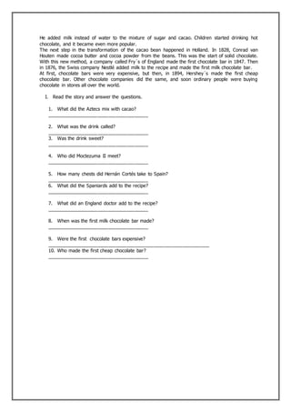 The document summarizes the history of chocolate, beginning with its origins in Mexico among the Maya and Aztecs. The Maya were the first to cultivate and consume cacao beans, using them to make drinks. They introduced cacao beans to the Aztecs, who also used them to make drinks and in religious ceremonies. Hernán Cortés brought cacao beans back to Spain after encountering the Aztecs, and Europeans eventually developed chocolate bars by adding sugar and milk. Chocolate became widely popular and consumed around the world after companies made cheaper chocolate bars available.