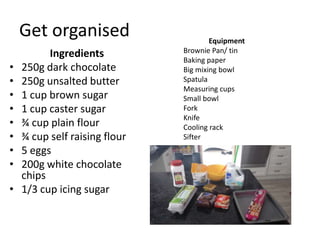 This document provides a recipe for homemade brownies. It lists the ingredients needed which include dark chocolate, butter, brown sugar, flour, eggs and white chocolate chips. The instructions explain how to prepare the brownie batter by melting the chocolate and butter together before mixing in the remaining wet and dry ingredients. The batter is then poured into a prepared pan and baked for 30-40 minutes until a knife inserted comes out clean. Once cooled, icing sugar is sifted over the top before cutting and serving the brownies.