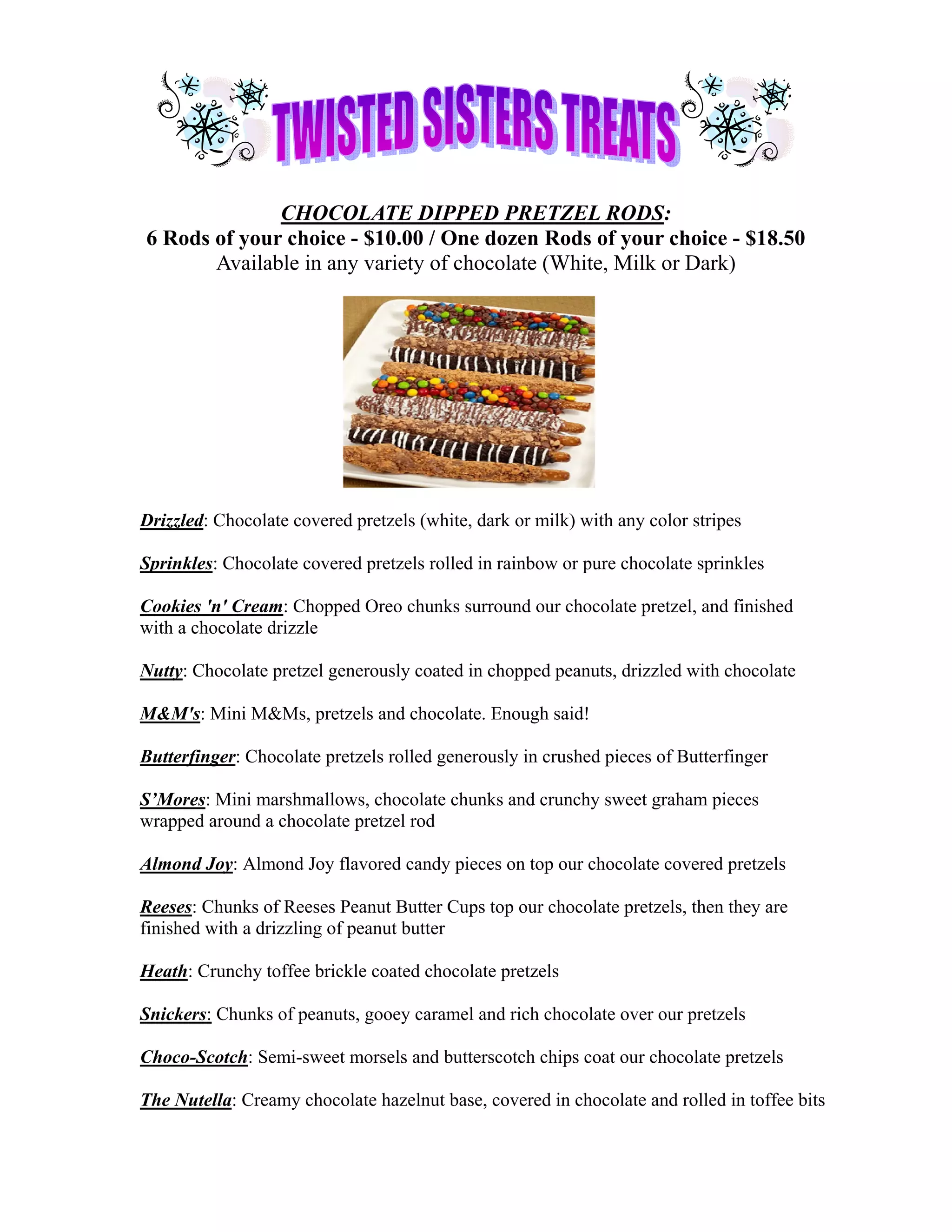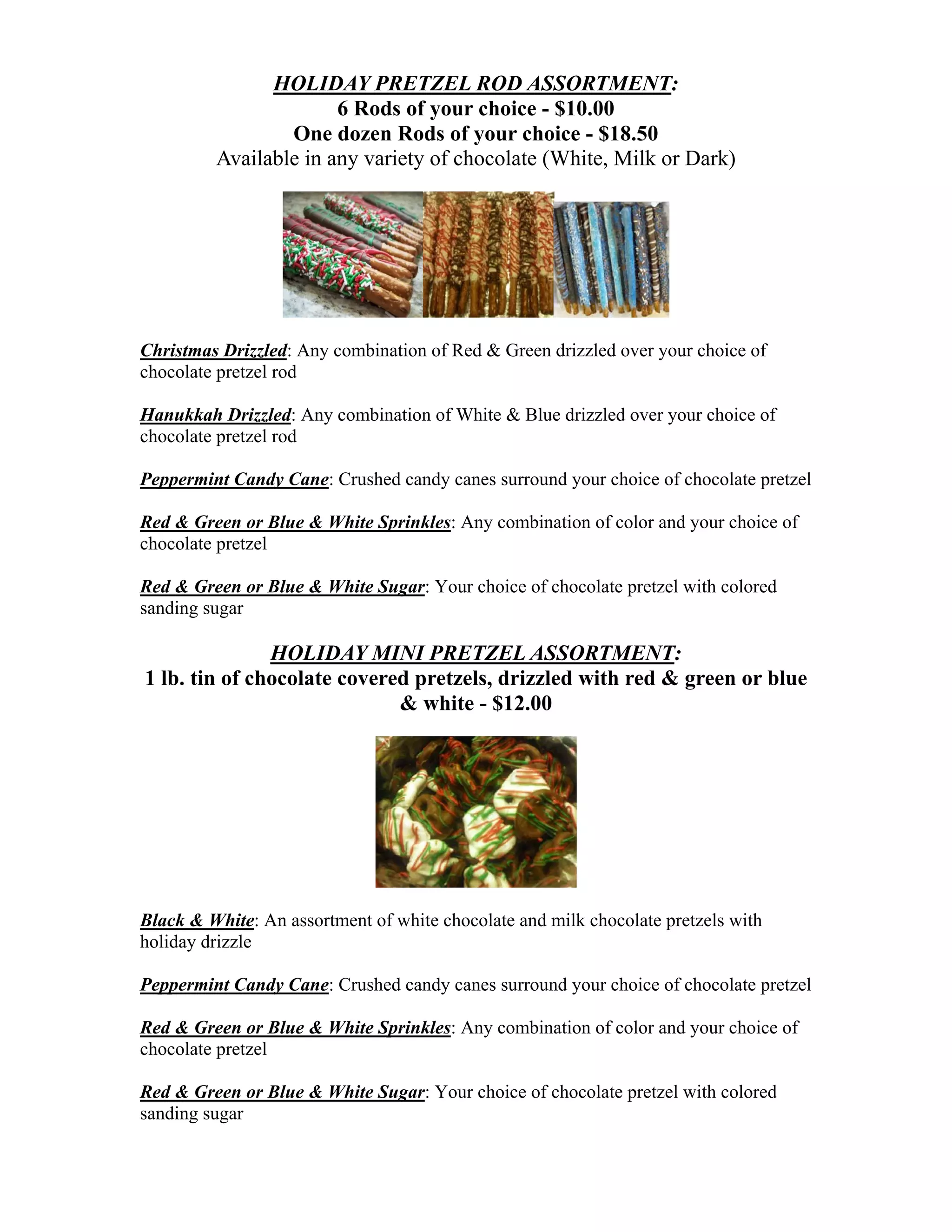 The document describes various chocolate covered pretzel, cookie, and candy options for holidays. It provides details on over 30 different chocolate covered items including pretzel rods, pretzel wreaths, Oreos, marshmallows, spoons, and cheesecakes in various flavors. Pricing is included ranging from $1-28.50 per item or package. Contact information is provided to place holiday orders.