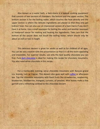 This document provides a recipe for a gourmet chocolate dessert called "chocolate mountains". It consists of layers of cream, custard and chocolates. Special care and equipment like a bain-marie is needed to properly melt and heat delicate ingredients like eggs and cream. The recipe serves both adults and children and makes for an impressive presentation, especially when topped with fresh fruits. Detailed instructions and a list of ingredients are provided to make this memorable chocolate dessert.