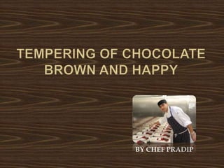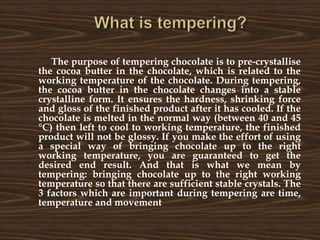 Tempering chocolate involves controlling the crystallization of cocoa butter to ensure the chocolate has a shiny appearance and snap when broken. The process involves: