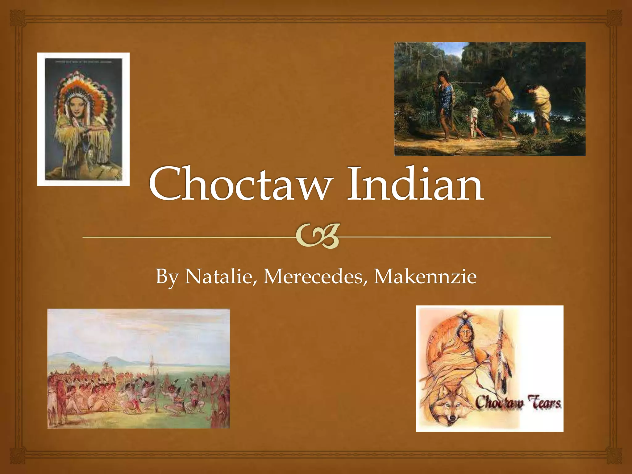The Choctaw Indians originally lived in the southeastern United States but were removed to Oklahoma in the 1830s via the Trail of Tears. The Treaty of Dancing Rabbit Creek forced the Choctaw onto reservations in Oklahoma. The Choctaw had distinct cultural traditions such as wood carvings, basket weaving, and circular dwellings called hogans. They traditionally wore deer skin skirts and ponchos, and the men also wore breechcloths. Children helped with chores while boys hunted and fished with their fathers and girls played with dolls.