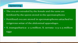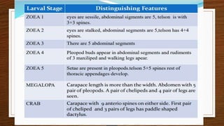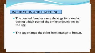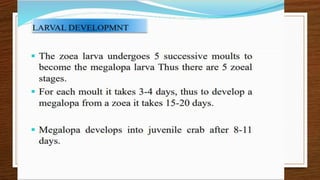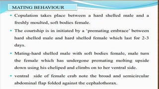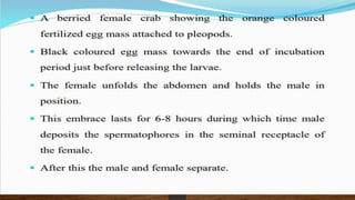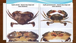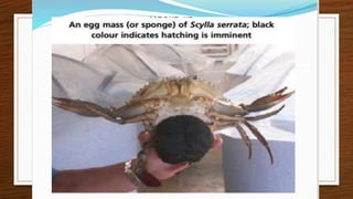 The document provides an overview of crabs, categorizing them within the animal kingdom and detailing their characteristics, reproduction, and importance in the ecosystem. Crabs are decapods with a varied lifespan and can live in both land and water, typically reproducing by laying eggs that have a low survival rate to adulthood. Additionally, crabs serve as a vital food source for marine animals and contribute to climate change mitigation while being nutritionally beneficial for human consumption.