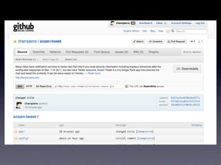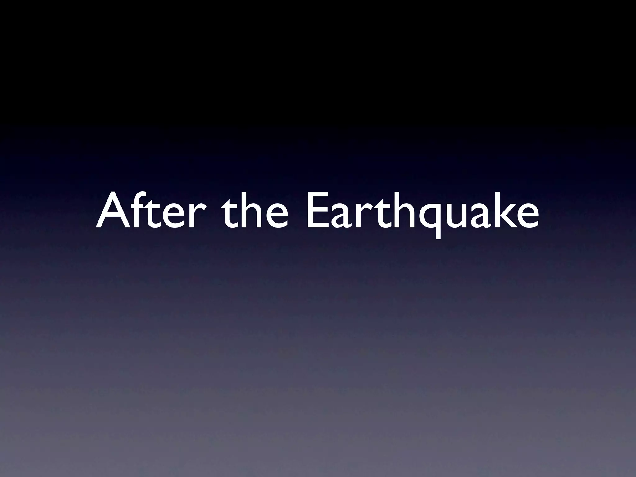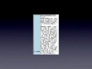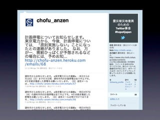 The document discusses a blackout schedule in Chofu after an earthquake. It mentions using social media and services like mailing lists for notifications. The setup is easy and can run on platforms like Heroku.