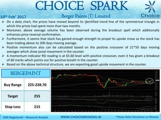 - The prices of the stock have broken out of a symmetrical triangle pattern it had been trading in for over two months, supported by above average trading volumes.