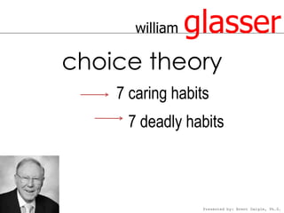 The document discusses William Glasser's choice theory, which includes 7 caring habits, 7 deadly habits, basic human needs, the quality world, the four parts of total behavior, and external vs. internal control. Choice theory was developed by William Glasser and focuses on how behaviors are motivated by an individual's need to satisfy basic psychological needs and their quality world mental pictures. The document was presented by Brent Daigle.