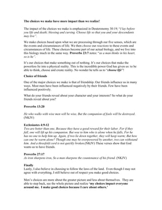 The document discusses the profound impact of choices on a man's life and the lives of those around him, emphasizing that every decision contributes to one's character and circumstances. It highlights the importance of making informed and wise choices, particularly regarding friendships and personal beliefs, while acknowledging the responsibility men have to care for their families and communities. Through biblical references, it underscores the notion that choices shape reality and can lead to either positive or negative consequences.