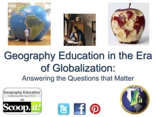 The document discusses the importance of geography education in the context of globalization, emphasizing that while geographical classifications remain relevant, the interconnectedness of regions is increasing. It outlines essential strategies for teaching geography, including providing information, teaching concepts, using data and technology, and promoting spatial thinking. The need for geographic literacy is underscored as a way to navigate and understand a complex, interconnected world.