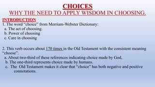 1. The document discusses the importance of applying wisdom when making choices. It outlines characteristics of choices that follow Satan's direction versus Godly choices.