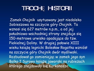 TROCHĘ HISTORIIZamek Chojnik usytuowany jest niedaleko Sobieszowa na szczycie góry Chojnik. Ta wznosi się 627 metrów n.p.m., a od jej południowo-wschodniej strony znajduje się 150-metrowe urwisko opadające do tzw. Piekielnej Doliny. W drugiej połowie XIII wieku książę legnicki Bolesław Rogatka wzniósł na szczycie góry Chojnik dwór myśliwski. Rozbudował go zamieniając w zamek jego syn Bolko I Surowy książę jaworski na rubieżach którego znajdowały się Karkonosze.