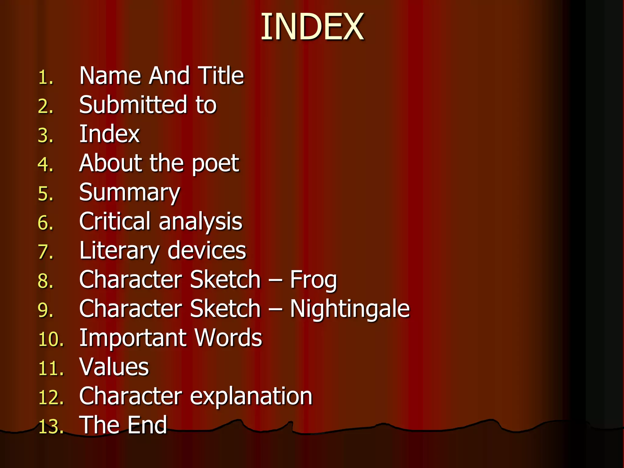 The document summarizes a poem about a frog and nightingale. The frog croaks loudly every night, while the nightingale sings beautifully. When the nightingale gains fame, the frog offers to train her voice to make it even better. However, the frog's training exhausts the nightingale, causing her voice to lose its beauty. She dies, allowing the frog to croak alone in the bog once more. The poem uses animals to convey themes of social criticism and the corrupt nature of developed societies driven by greed.