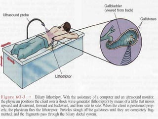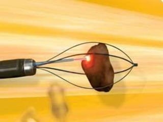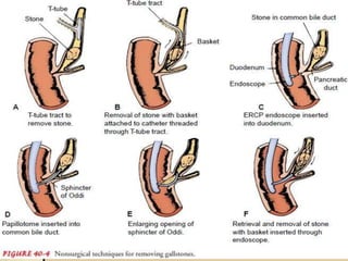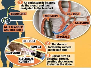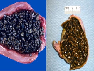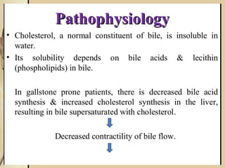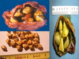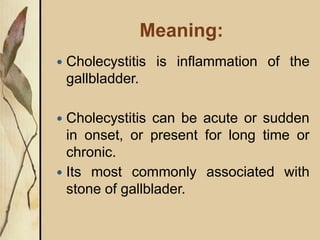 Cholecystitis refers to inflammation of the gallbladder. It is most commonly caused by gallstones which can block the cystic duct and cause bile to build up. There are two main types - acute cholecystitis which occurs suddenly and causes severe pain, and chronic cholecystitis which is a long-term lower intensity inflammation. Diagnosis involves blood tests, imaging like ultrasound or CT scans. Treatment options include pain medication, antibiotics if infected, and surgical removal of the gallbladder (cholecystectomy) for severe or long-term cases.
